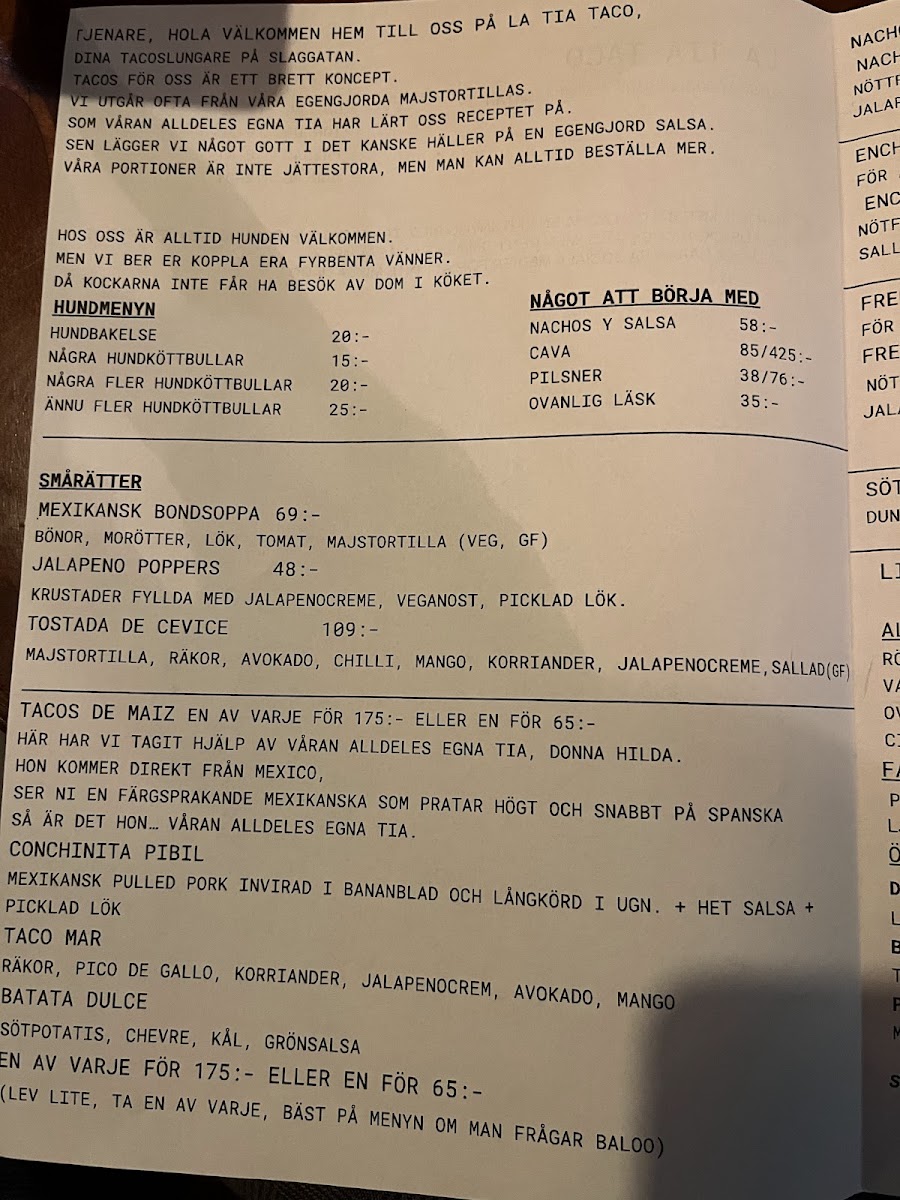 The menu at La Tia Taco offers a delightful mix of bold flavors and hearty dishes, perfect for those craving comfort food with a twist. Among the highlights is the Hästkorvsmacka, a Swedish take on a classic hot dog sandwich, which stands out with its unique combination of flavors and texture. For those seeking something lighter, there are several taco options, each packed with fresh ingredients and vibrant spices. The restaurant also features savory side dishes and delectable drinks that complement the main offerings. With a focus on both local ingredients and international influences, La Tia Taco's menu promises a satisfying experience for all tastes. Whether you're in the mood for something traditional or a little more adventurous, the varied selection ensures there is something for everyone.